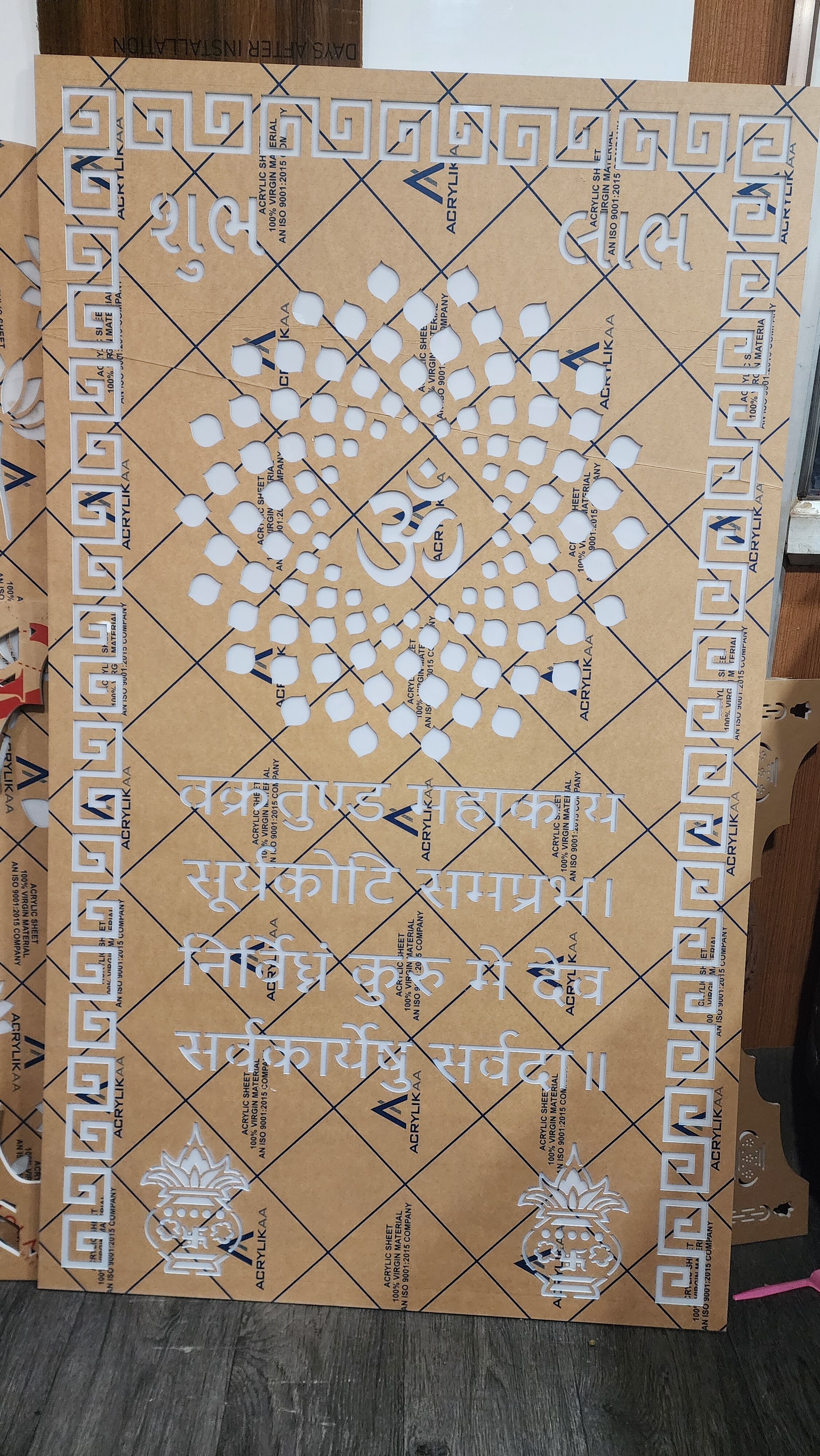 An Acrylic Backlit Sheet for Temple is a beautifully designed decorative panel created using high-quality acrylic material and precision laser cutting. When LED lights are placed behind the sheet, the intricate patterns glow with a soft and divine illumination, creating a spiritual and elegant atmosphere in the temple. The smooth finishing, detailed design, and perfect light diffusion make the artwork appear more vibrant and eye-catching. It enhances the beauty of home temples, mandirs, or spiritual spaces by giving them a modern yet traditional touch. Acrylic backlit panels are durable, lightweight, and easy to install, making them a perfect choice for temple decoration.